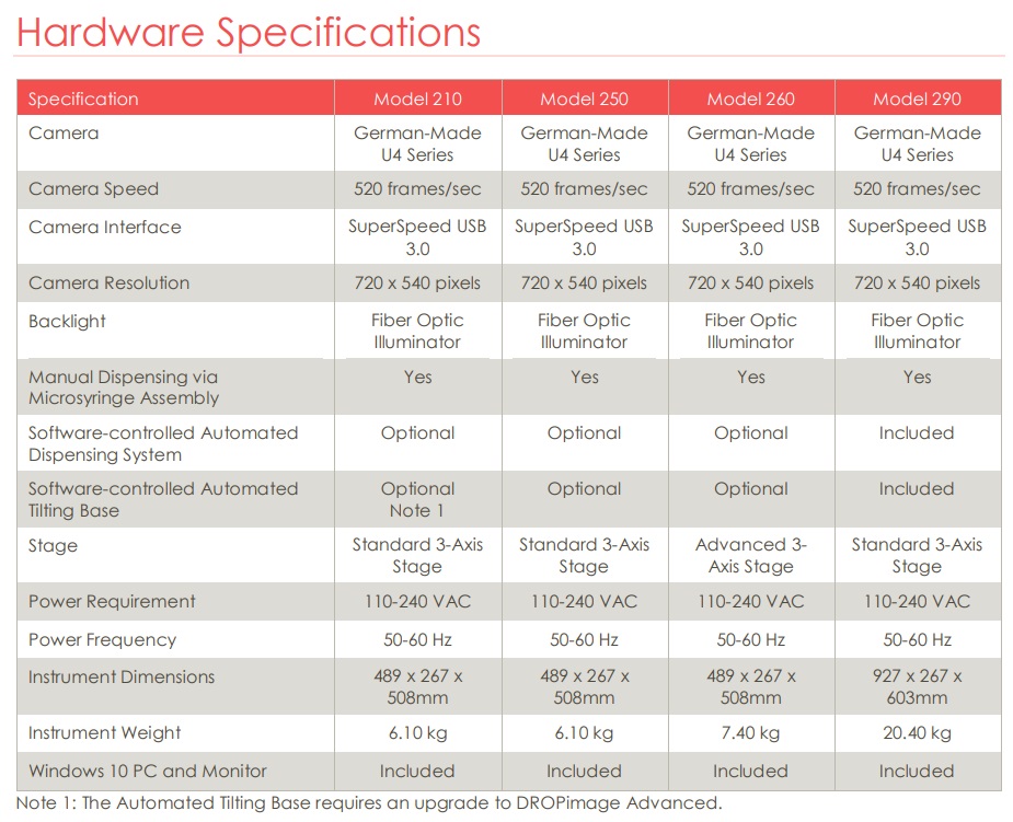 ramé-hart提供了四種不同的 200系列中的型號 角度計/張力計。不少于 這些模型包括我們的 標準16英寸光學工作臺,U4 520幀/秒系列USB 3.0 超高速德國制造 相機和我們強大的纖維 可調式光學照明器 明亮的白色背光。 210型以DROPimage為特色 專業軟件,能夠 測量所有類型的接觸 角度、表面能、表面 張力和界面張力。 型號250與型號相同 210,但是 包括我們的DROPimage 高級軟件 基于方法的實驗 針對以下方面優化的設計工具 動態和時間相關的 學習。 型號260與型號相同 250,3軸平臺除外 它已升級到 高級三軸舞臺。這 允許支持附加的配件——最引人注目的是 環境室100-07。 型號290與型號相同 標準3軸250度 標本階段,除了它 還包括自動化 分配系統和 自動傾斜底座。這 高度自動化的配置 對那些 正在前進 后退接觸角研究。 這些久經考驗的配置 提供最高水平的 為了錢而表演。 200系列中的所有型號 包括個人電腦和顯示器 讓他們完全交鑰匙 解決方案–隨時可以即插即用。