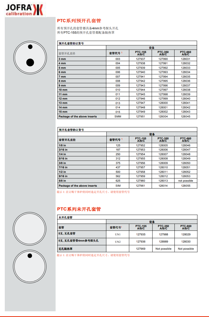 兩種多孔套管套件可以滿足絕大多數(shù)溫度探頭的尺寸。第 一種套件是公制套件,包含4支套管,開孔尺寸從3mm至 13mm。另一種套件是英制套件,包含3支套管,開孔尺寸 從1/8"至1/2"。 所有套管都預(yù)留了參考探頭孔。一旦在便攜箱中配備了這 些套管之后,用戶就可以校準(zhǔn)所有常用尺寸的溫度探頭 了。