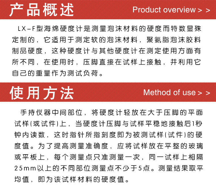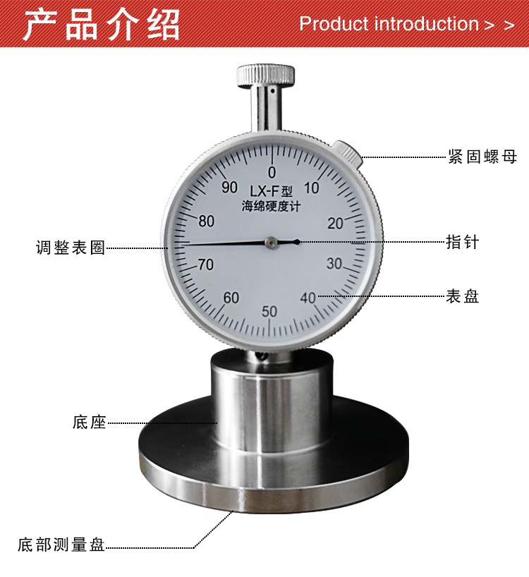 LX-F海綿硬度計是本廠為了方便客戶測量泡沫材料的硬度而特殊定制的硬度計,它適用于測定軟的泡沫材料,聚氨脂泡沫膠料制品硬度,這種海綿硬度計與其他硬度計在測定使用方面有所不同,在使用時,壓腳直接在試樣上接觸,并利用它自己的重量作為測力負荷。