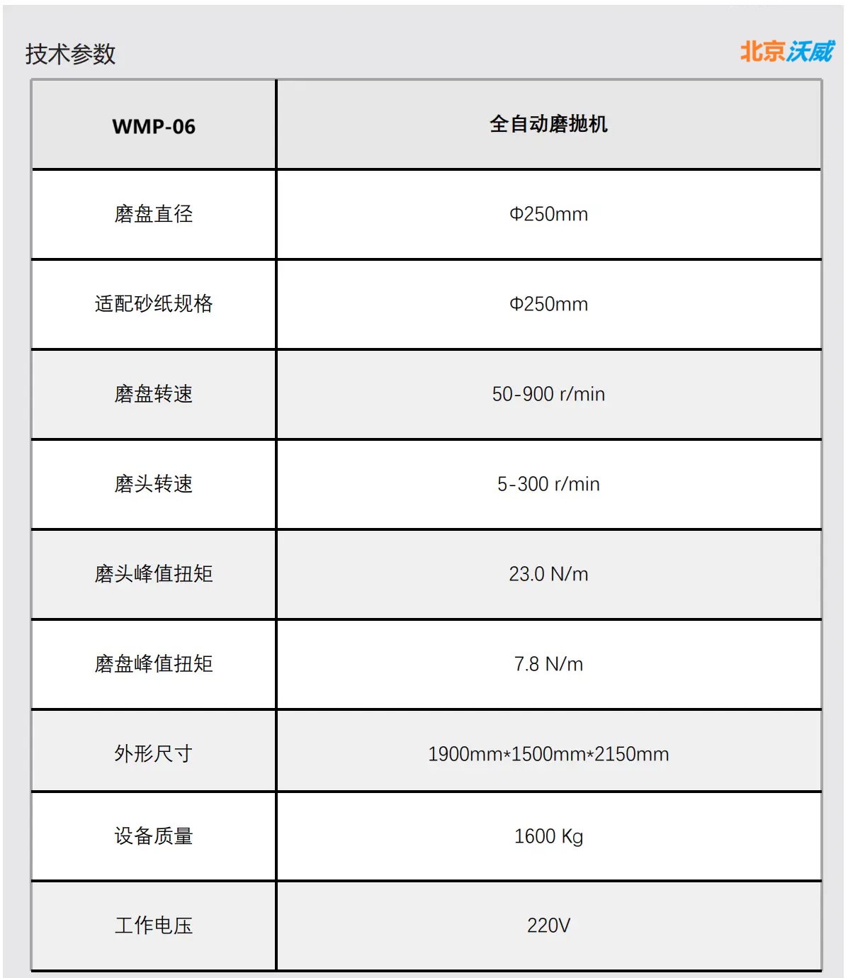 WMP-06整機由PLC高精控制,桁架結構與花鍵設 計使設備具備更高的剛度和穩定性,磨拋頭與磨 拋盤在速度、壓力、方向上皆可自由轉換,最大 大程度地探究了不同金屬樣品制樣的最佳工藝。