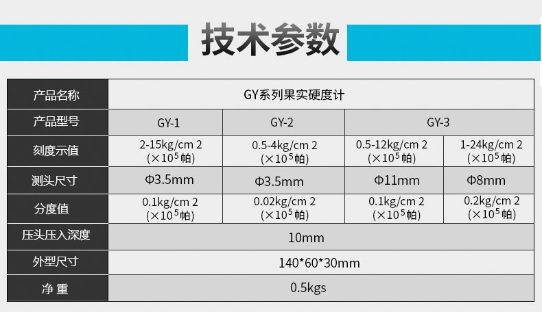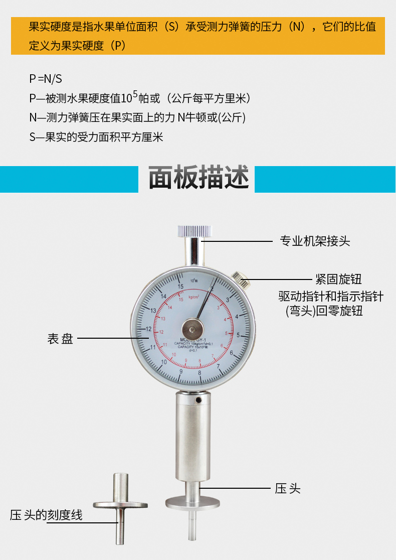 水果硬度計(又稱果實硬度計或果品硬度計),該產品共分GY-1,GY-2,GY-3三種型號,用來測量蘋果、梨、西瓜、香蕉等多種水果的硬度,用以判定水果的成熟程度,對培育良種,采摘時間,加工時間,收獲儲存,出口運輸等采摘的合理掌握。