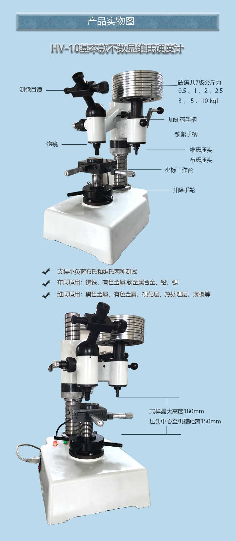 HV-10型維氏硬度計是一種直接施加試驗力的硬度計,具有試驗力精度高、穩定性好、適用范圍廣、操作方便等特點。本硬度計還可選配Φ1mm、Φ2mm鋼球壓頭,用于布氏硬度的測試。維氏硬度試驗可對黑色金屬(不包括鑄鐵)、有色金屬、硬質合金及硬化鉻層、化學熱處理層、高頻淬火層及薄板試樣進行硬度試驗。布氏硬度試驗可對鑄鐵、有色金屬及質地較軟的輕金屬和合金、鉛、錫等材料進行試驗。